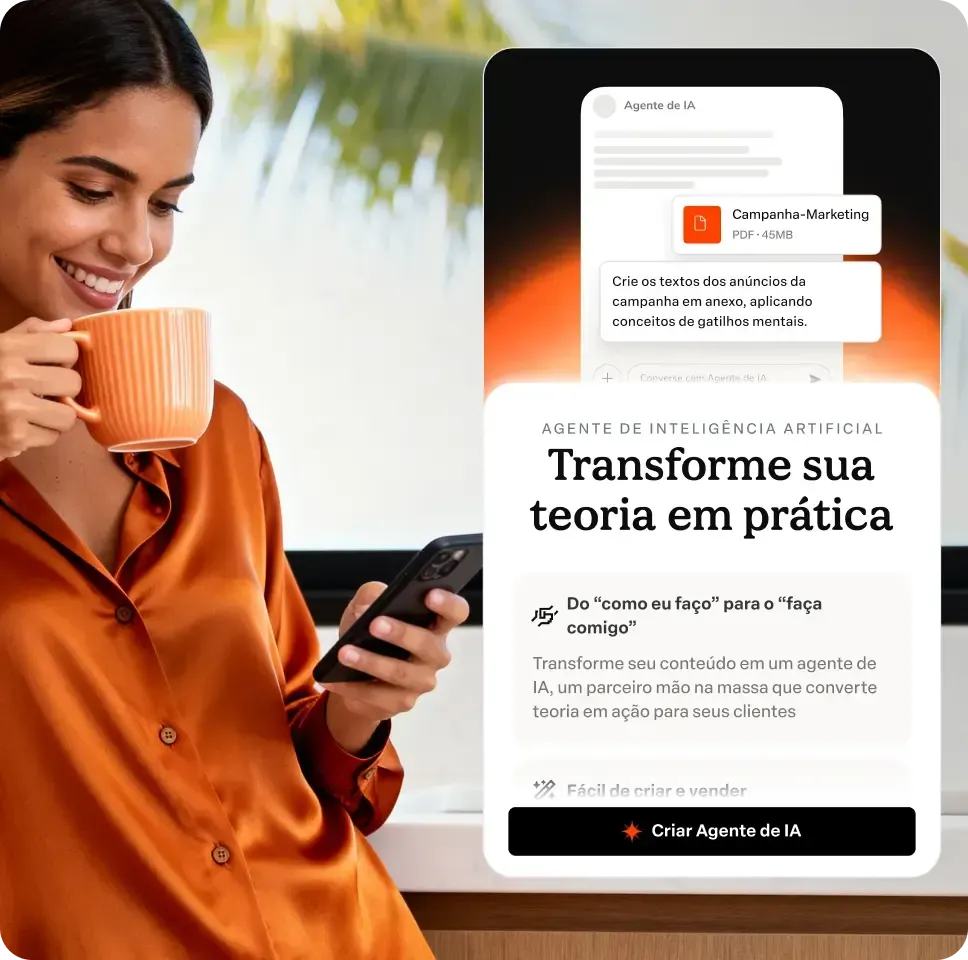Antes, seu conteúdo ensinava. Agora, ele também, executa. Com o Agente de Inteligência Artificial da Hotmart, você pode criar um novo tipo de produto digital que transforma o seu conteúdo em um parceiro que trabalha pelos seus clientes e gera uma nova fonte de receita para você.